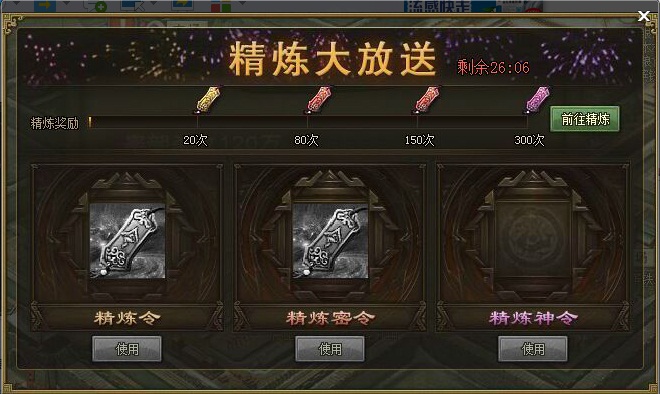 活动内容:活动期间,达到以下精炼要求,即可获赠免费精炼次数,以及3种特殊精炼机会。