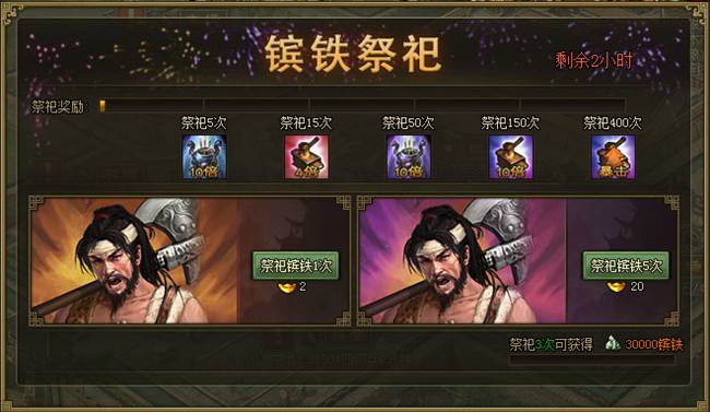 活动内容:活动期间,达到以下镔铁祭祀要求,即可获赠额外镔铁奖励,并领取相应的暴击Buff!