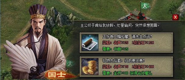 1. 结交名士(或国士)奖励:每次结交,可随机获得经验、粮食、镔铁、宝石、丝绸(仅限160级及以上)的其中一种