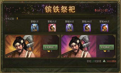 活动内容:活动期间,达到镔铁祭祀要求,即可获赠额外镔铁奖励,并领取相应的暴击Buff!若开启神兵,相应档次奖励则为百炼钢。