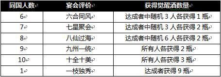 g)参宴的10人中,同一国家的人数越多,该国玩家获得的宴会评价越好,可获得觉醒酒、点券数量越多。