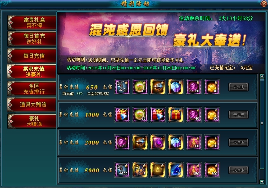 活动规则:活动期间,每天玩家累计充值满200元宝,可以选择领取一个奖励,每天最多可以领取100次奖励,累计充值元宝每天24点清零