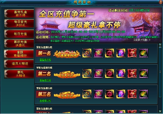 活动规则: 活动期间,累计充值满50000元宝即可进入排行榜,全区前十的玩家可以获得绝版称号,排名越高,奖励越好,活动结束后奖励自动发放!