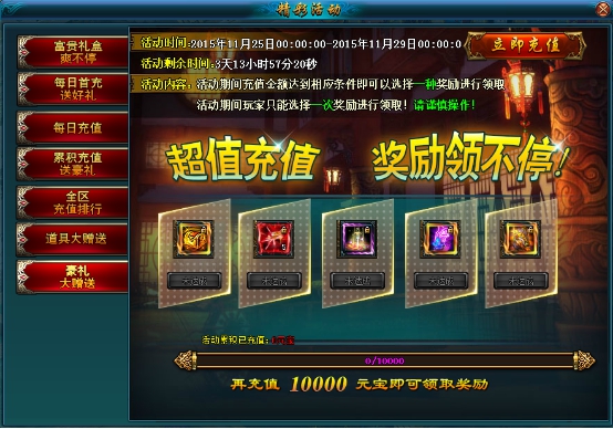 活动内容:活动期间内每天充值累计到一定的金额都可以领取丰厚的大礼!