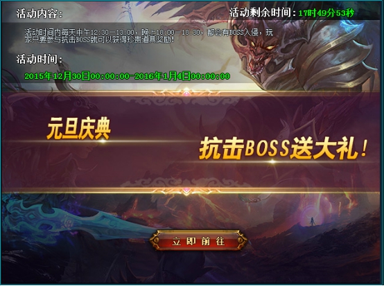 活动规则:活动期间每天12:30-13:00,晚上18:00-18:30,都会有BOSS入侵,玩家只要参与抗击boss就可以获得珍贵的道具奖励!