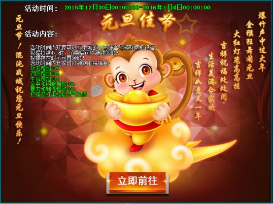 活动规则:活动期内,玩家可以再主城的元旦使者处领取随机祝福,祝福可持续4小时,消失后可继续领取。