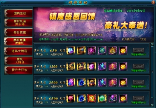 活动内容:活动期间内只要充值到一定的元宝金额都可以领取豪华大礼包!