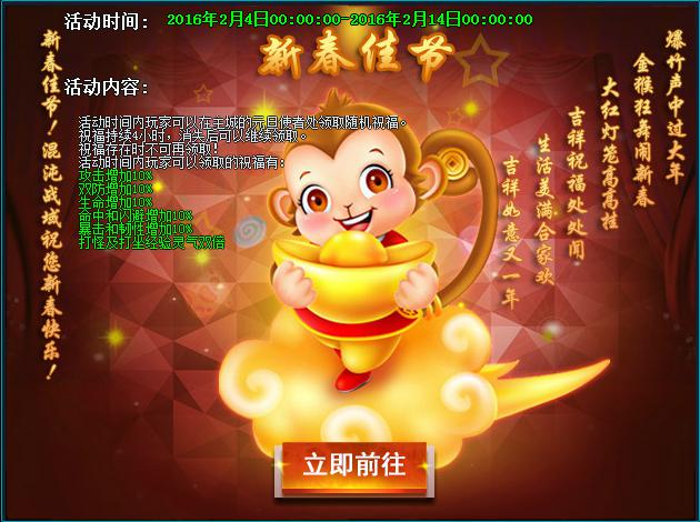活动规则:活动期内,玩家可以在主城的春节使者处领取随机祝福,祝福可持续4小时,消失后可继续领取。