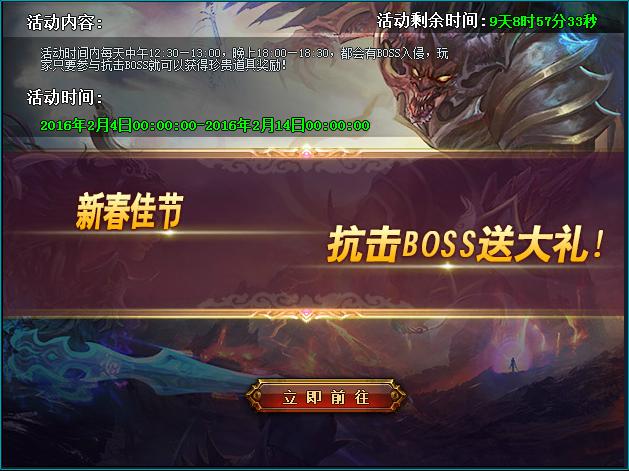 活动规则:活动期间每天12:30-13:00,晚上18:00-18:30,都会有BOSS入侵,玩家只要参与抗击boss就可以获得珍贵的道具奖励!