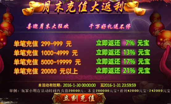 活动规则:活动时间内,玩家充值一定金额,即可获得一定的充值返利!