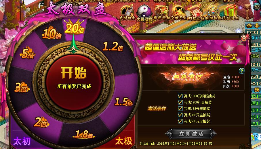 活动时间:2016年7月29日00:00--2016年7月29日23:59:59(开服7天内的服务器不参与此活动)