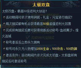 活动说明:活动期间可依次使用铜钱、礼金、元宝进行抽奖返利,可获得绝版称号。