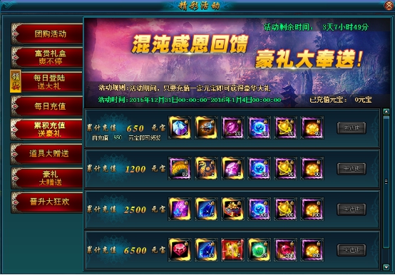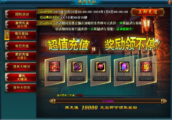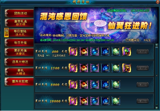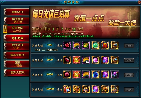 活动规则:活动期间,玩家每天充值一定的元宝就可以获得丰厚的大礼