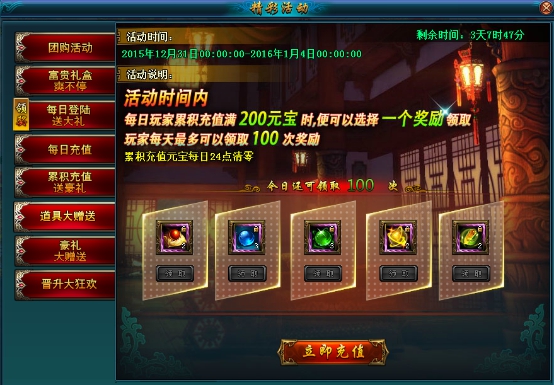 活动规则:活动期间,每天玩家累计充值满200元宝,可以选择领取一个奖励,每天最多可以领取100次奖励,累计充值元宝每天24点清零