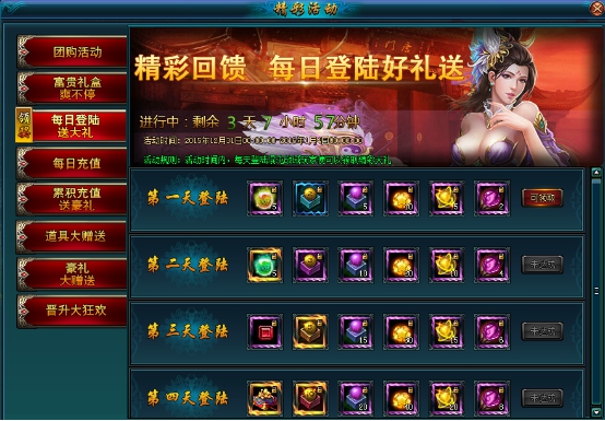 活动规则:活动期间,每天登陆游戏的玩家便可以领取精彩大礼