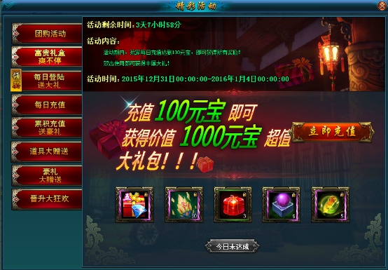 活动规则:活动期内,玩家每日充值达到100元宝,即可获得奖励!