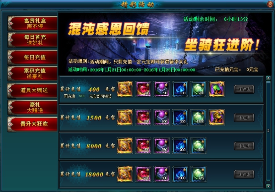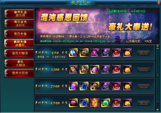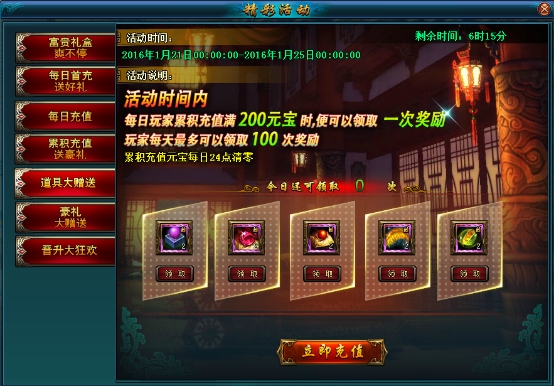活动规则:活动期间,每天玩家累计充值满200元宝,可以选择领取一个奖励,每天最多可以领取100次奖励,累计充值元宝每天24点清零