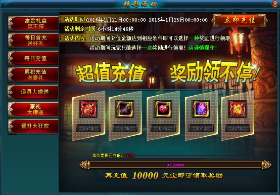 活动内容:活动期间内每天充值累计到一定的金额都可以领取丰厚的大礼!