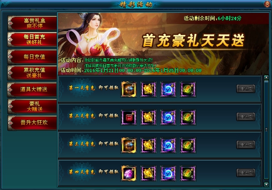 活动规则:活动时间内,每天首充都可以领取额外大奖,连续完成每天首充更可以获得额外豪华大礼!