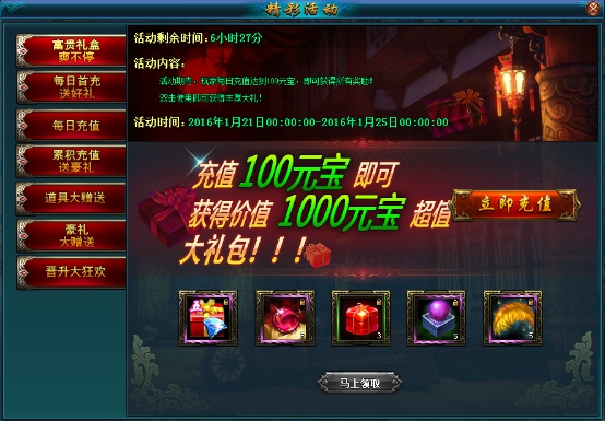 活动规则:活动期间,玩家每日充值达到100元宝,即可获得豪华礼包,双击使用可以获得丰厚大礼!