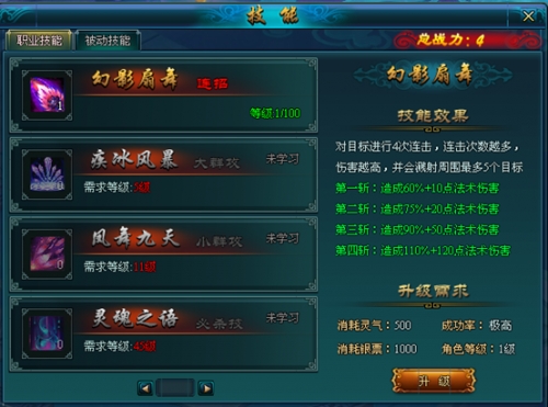 每种技能都可以通过升级来提高技能威力,最多修炼到100级;技能达到一定级别时,产生惊天动地的威力!