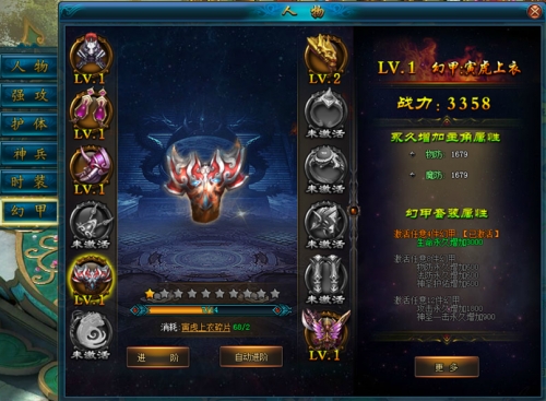 3.幻甲激活后会出现进阶界面,点击“进阶”或者“自动进阶”按钮可对幻甲进行进阶,提升属性