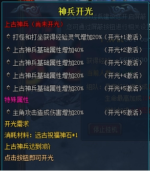 当上古神兵达到3阶可以进行开光操作,需要消耗远古祝福神石,每次开光都会获得大大的奖励,开光5次还可以获得特殊属性加成!