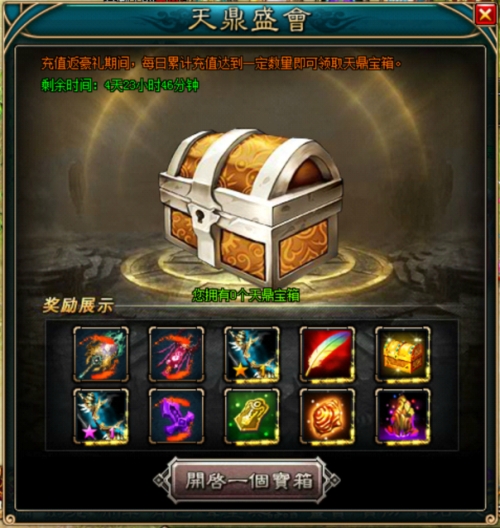 在活动开启时间内,每日累计充值达到指定额度,即可领取相应档次的奖励一份,每档次奖励中有不同数量的天鼎宝箱。每档次奖励每日只能领取1次,每日00:00将每日累计充值额度重置为0。