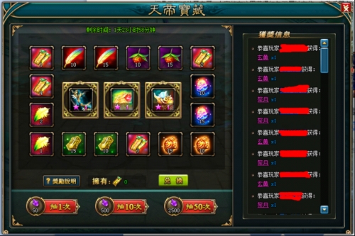 3、抽取天帝宝藏有几率获得“天帝券”,使用天帝券可进入秘宝库兑换界面兑换不同的宝物奖励。