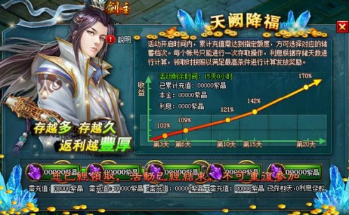 首先,大家要清楚一点,天阙降幅活动最多可以存储1W紫晶,如果你在活动开始的第一天就存储,那么可以通过存储20天拿到最高170%的收益比例,也就是能够最多得到7000紫晶的额外返利哦!