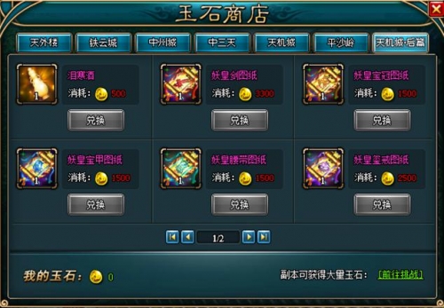 天机城·后篇玉石商店开放了,兑换更高级的装备和材料。其中包括泪寒酒和妖皇套装的图纸,各位看官都以可以到商店里选购自己需要的装备哦。