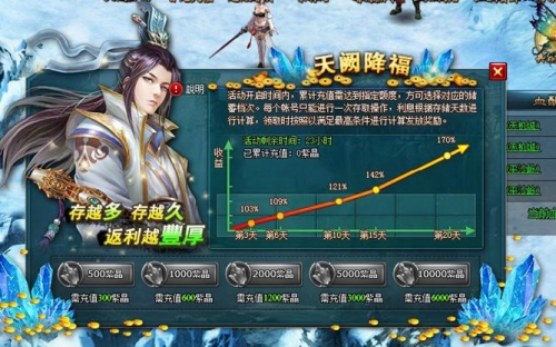 但是有点最重要的,这个活动必须是在你充值到6000紫晶以后才能开放存储,也就是说,即使你有1W紫晶的存款,如果你不是在天阙降福活动期间进行6000紫晶的充值,是一样不能进行活动的相关操作的。