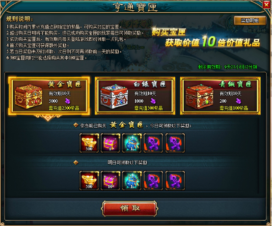 9)宝匣购买时间只有三天,但领取奖励可是十天哦,只要每天登陆就能领取了。