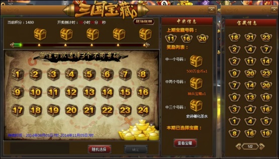 新增趣味系统《三国宝藏》玩家70级完成相应主线任务可以开启三国宝藏系统。玩家可以*选择24个宝藏号码中的其中3个不同的宝藏,也可以随机选择。如果所选号码与系统一致则按照规则获得奖励。每消耗1元宝等于1积分,积分达到对应奖励值可以获得极品道具。