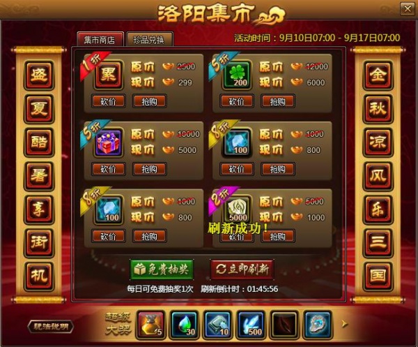 9月10日7点-9月17日7点,玩家可以在洛阳集市购买道具物品,集齐对应的字,可在洛阳集市珍品兑换中兑换豪华大礼。