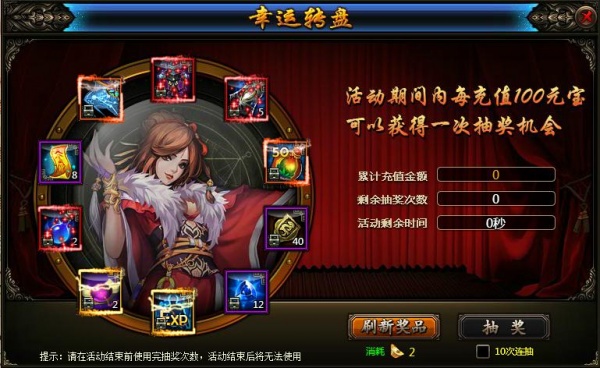 1、活动时间内每充值100元宝,即可获得一次抽奖机会;
