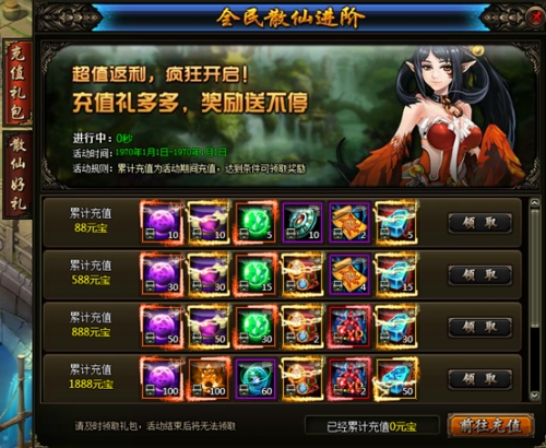 2、散仙好礼:活动期间内散仙进阶消费达到对应额度即可领取奖励(需要在散仙强化界面内购买强化丹或进阶丹才计入消费额度)