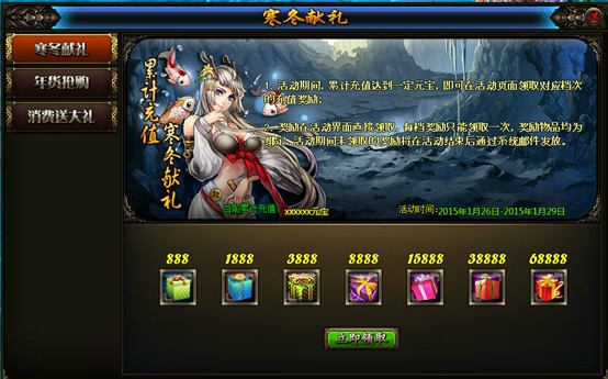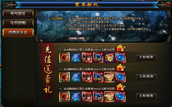 2、奖励在活动界面直接领取,每档奖励只能领取一次,奖励物品均为绑定,活动期间未领取的奖励将在活动结束后通过系统邮件发放。