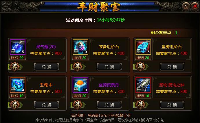 3、活动结束后,将无法使用剩余“聚宝点”兑换物品,建议您在活动期间内及时兑换;