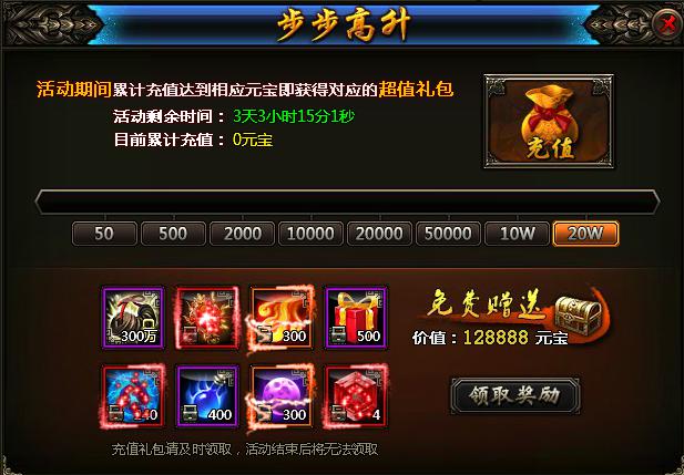 1、活动时间内累计充值50、500、2000、10000、20000、50000、10W、20W元宝均可领取赠送道具