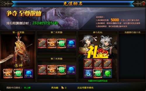 1、活动当天开启充值排名活动,充值满5000元宝以上,即可参与该活动。