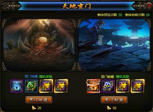 1、每日可探宝次数50次,协助次数10次,每次花费少量的元宝可获得不同档次的物品奖励;