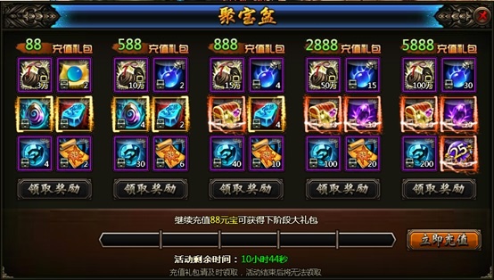 1、每充值88元宝、588元宝、888元宝、2888元宝、5888元宝可获得不同档次的物品奖励;