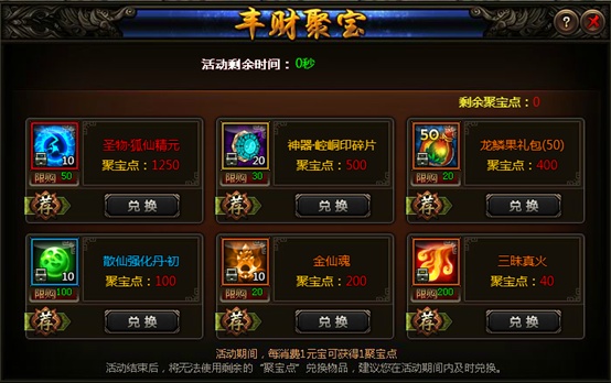 3、活动结束后,将无法使用剩余“聚宝点”兑换物品,建议您在活动期间内及时兑换;