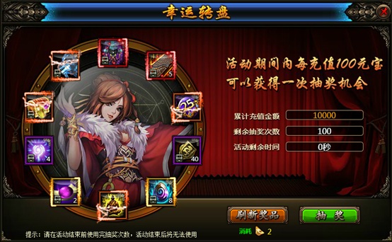 1、 活动时间内每充值100元宝,即可获得一次抽奖机会;