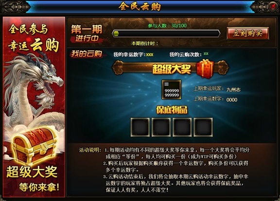 2、 云购活动结束后,系统会抽取本期活动幸运数字,抽中幸运数字的玩家将独占超级大奖