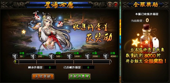 3、 贡献许愿星可以获得对应的礼包奖励,也可以通过元宝进行贡献