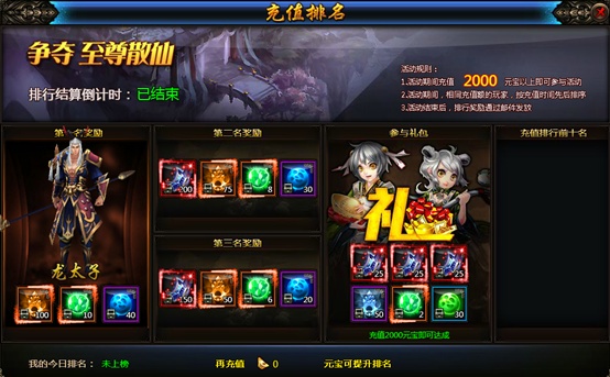 1、 活动当天开启全服充值排名活动,充值满2000元宝以上,即可参与该活动。