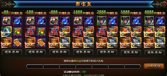 1、 每充值88元宝、588元宝、888元宝、2888元宝、5888、8888元宝可获得不同档次的物品奖励;