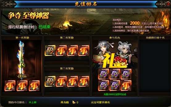 1、活动当天开启全服充值排名活动,充值满2000元宝以上,即可参与该活动。